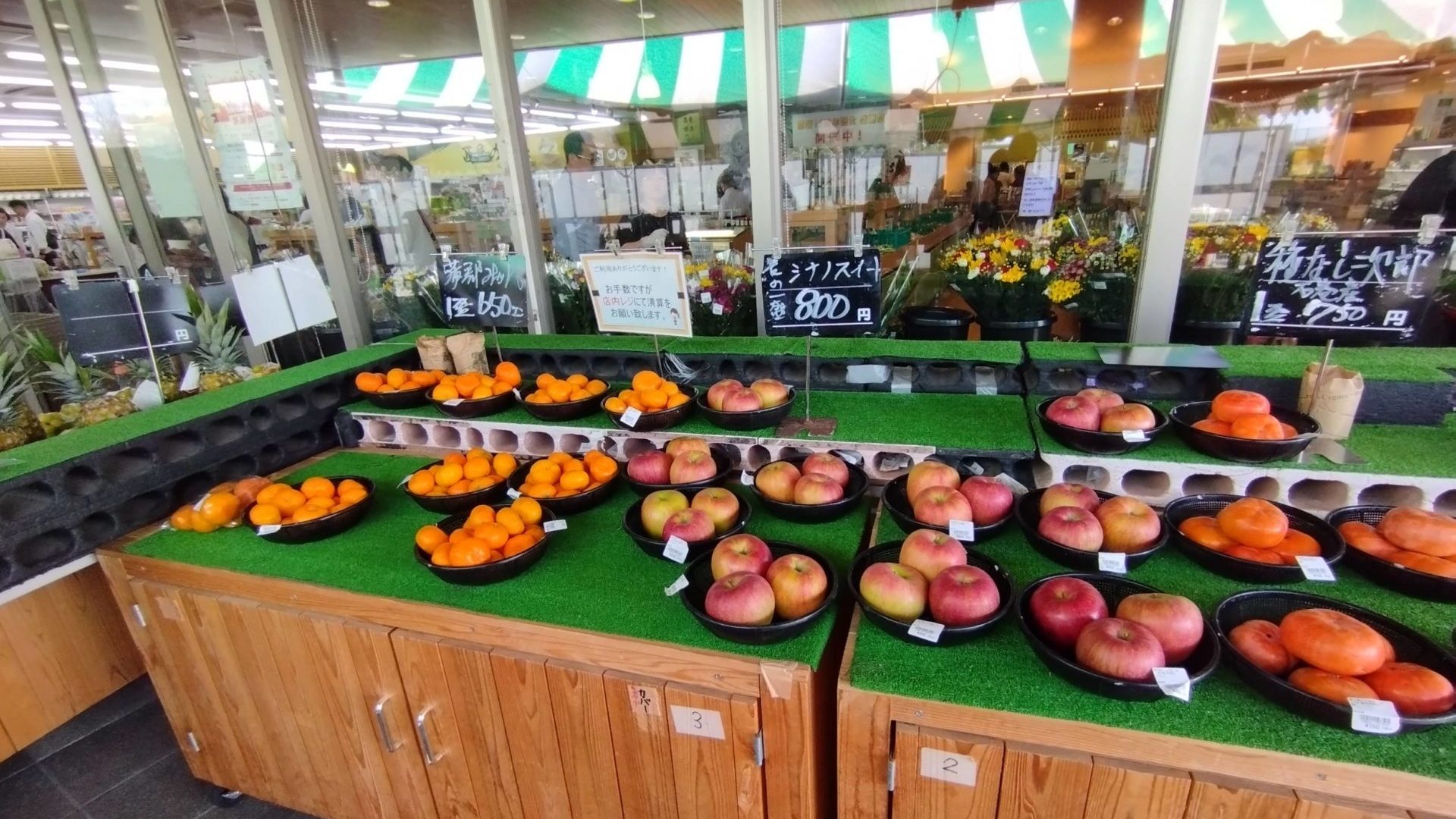 建物の外には新鮮な果物や野菜が並んでおり、訪れた日もみかんやりんごなどがずらり。